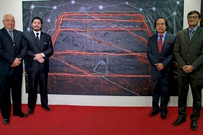 Installation of the painting “Historia del huaquero afortunado” (the story of the lucky graverobber), made by Cuban plastic artist José Bedia. Officers of the Chamber Of Mines Of Peru are next to the painting. This work is part of the private collection of our institution.