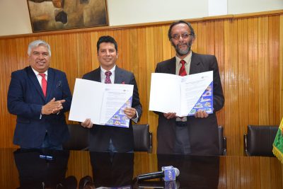 Agreement entered into between the Technical University of Oruro (UTO) and the Chamber Of Mines Of Peru. Participants: Dr. Carlos Castagnola (Senior Management Advisor of the Chamber Of Mines Of Peru), Ing. César Gallardo (President of the Chamber Of Mines Of Peru) and Ing. David Rojas (UTO’s Rector) – Bolivia, 2018.